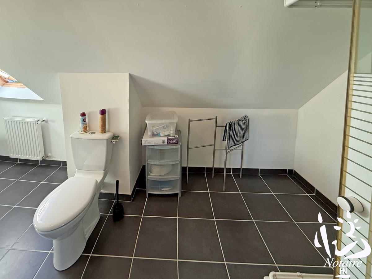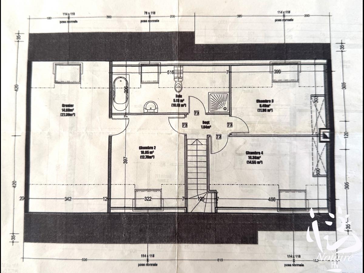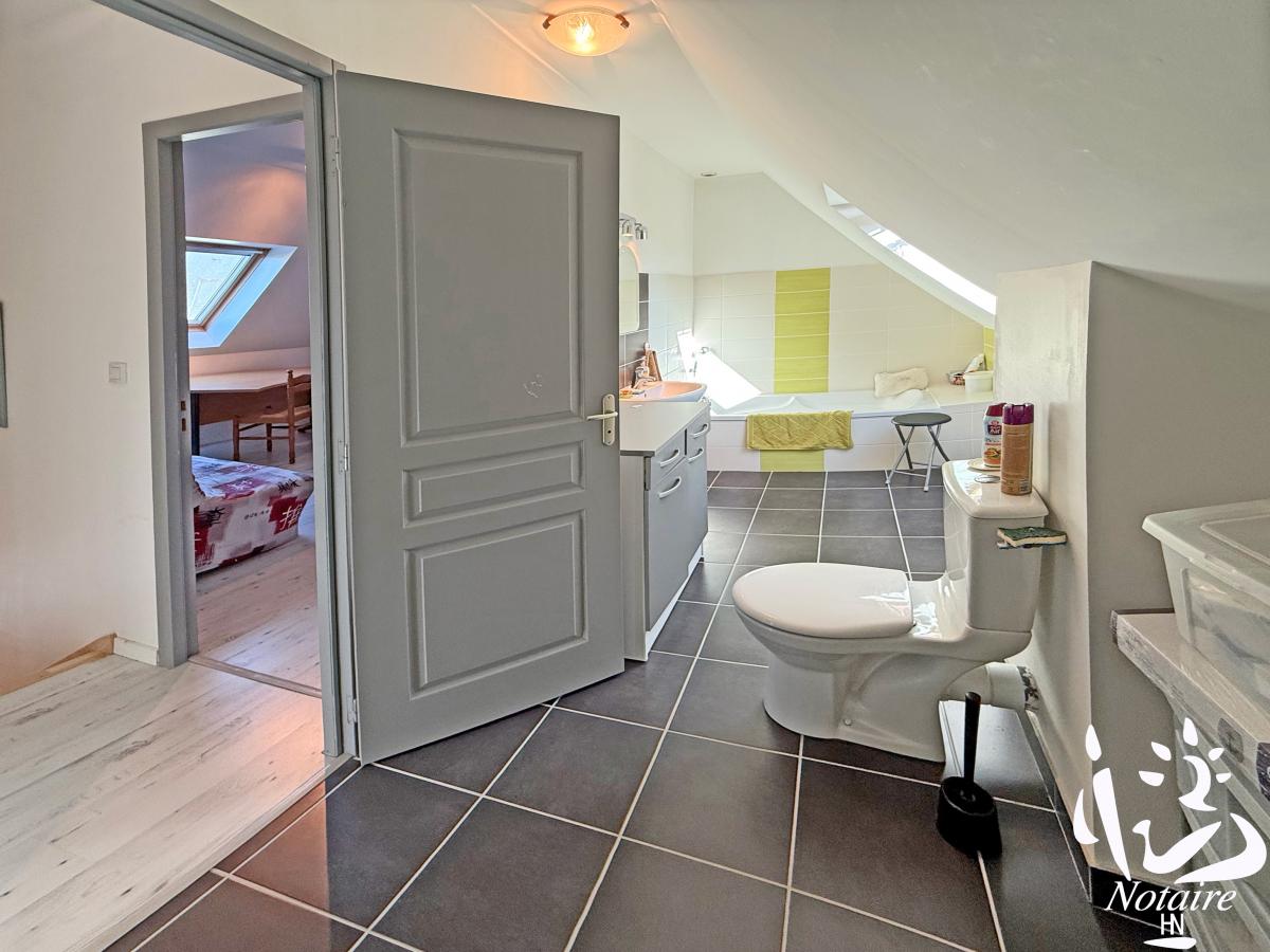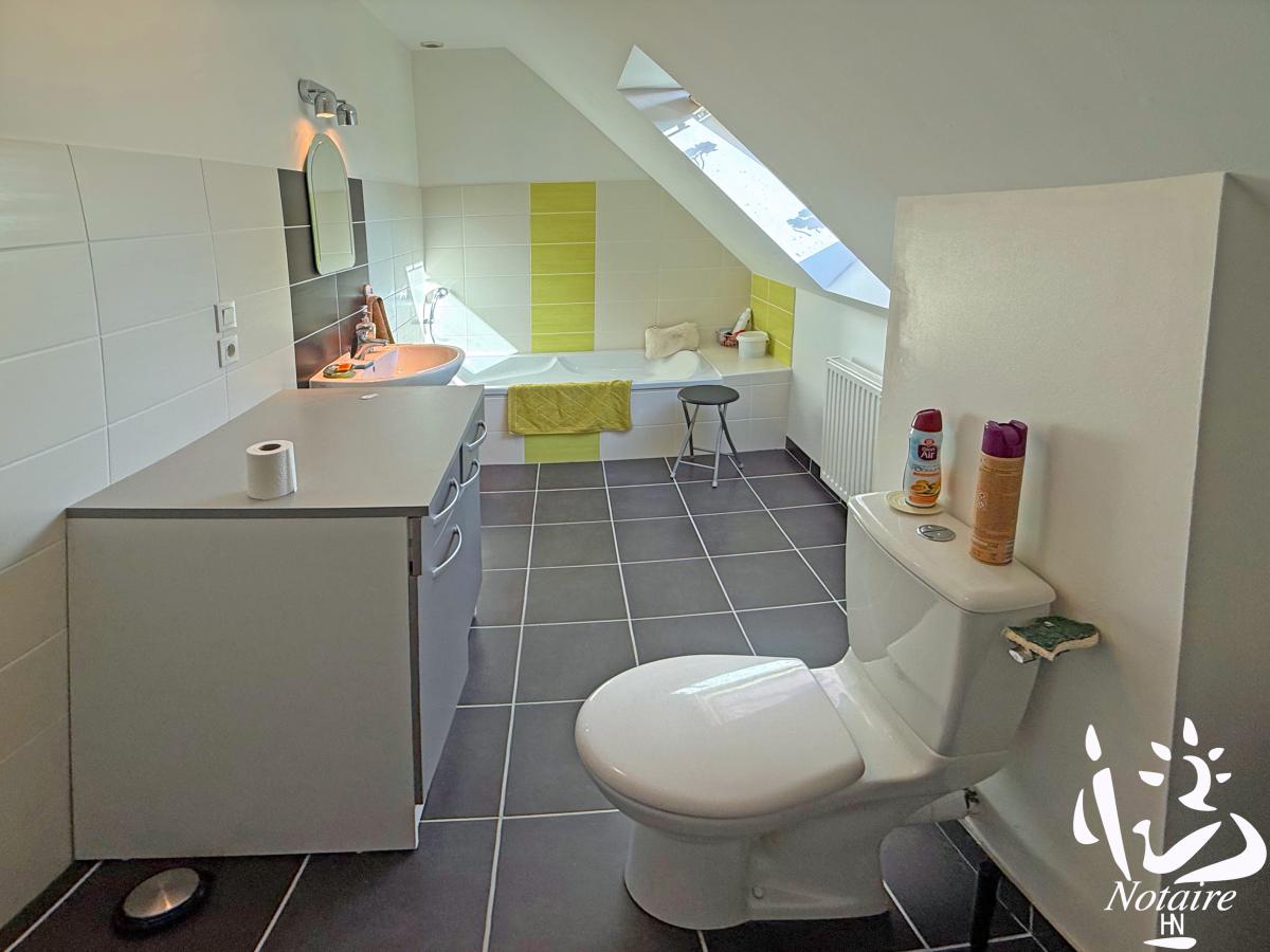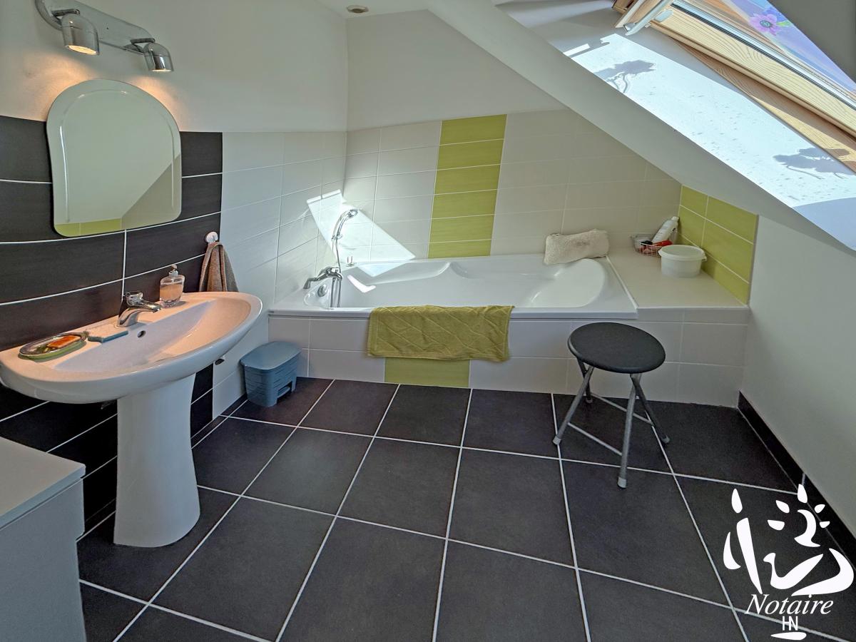 A l'étage, une salle de bain comprenant baignoire et douche, wc, lavabo, 3 chambres dont une qui s'ouvre sur le grenier de 14 m2 au-dessus de 1,80 m de hauteur.