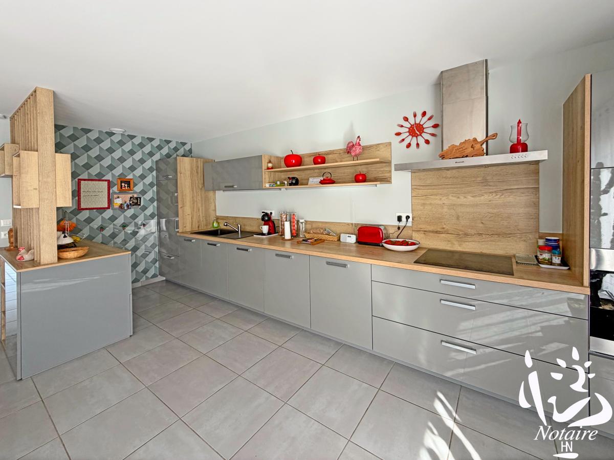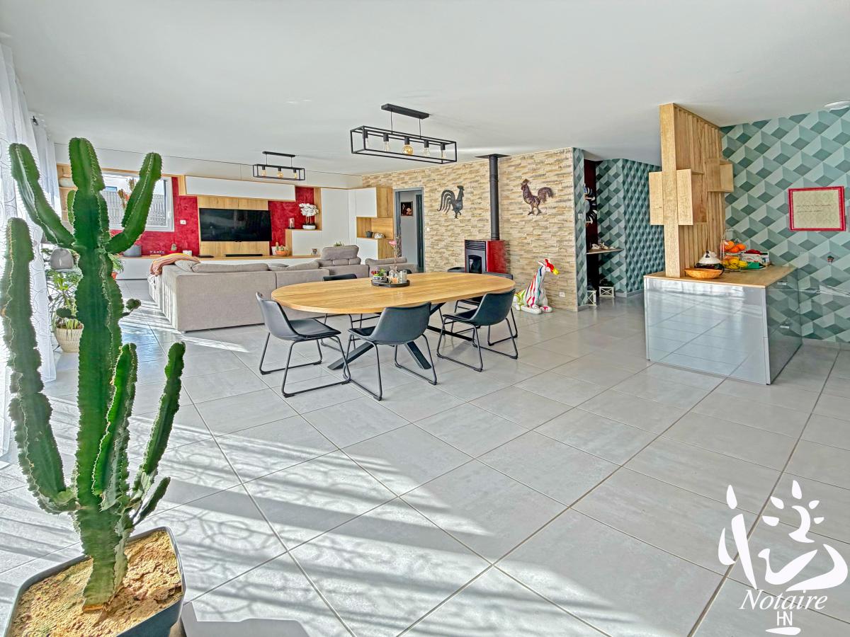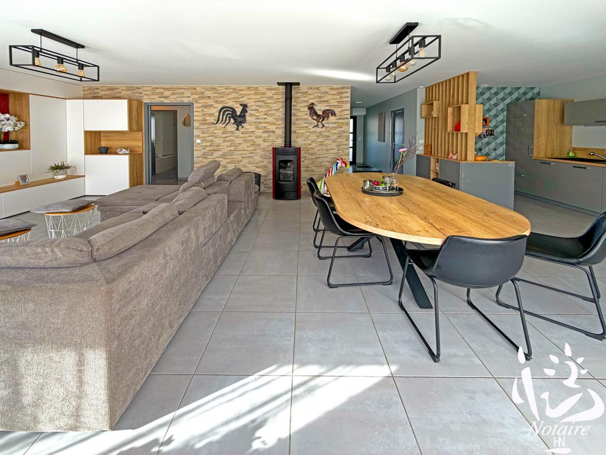 Dès l’entrée, vous découvrez une superbe pièce de vie spacieuse et lumineuse, avec salon chaleureux équipé d’un poêle à pellets, salle à manger conviviale et cuisine moderne entièrement aménagée et équipée, ouverte sur l’ensemble.