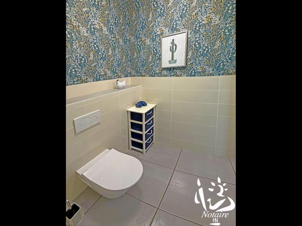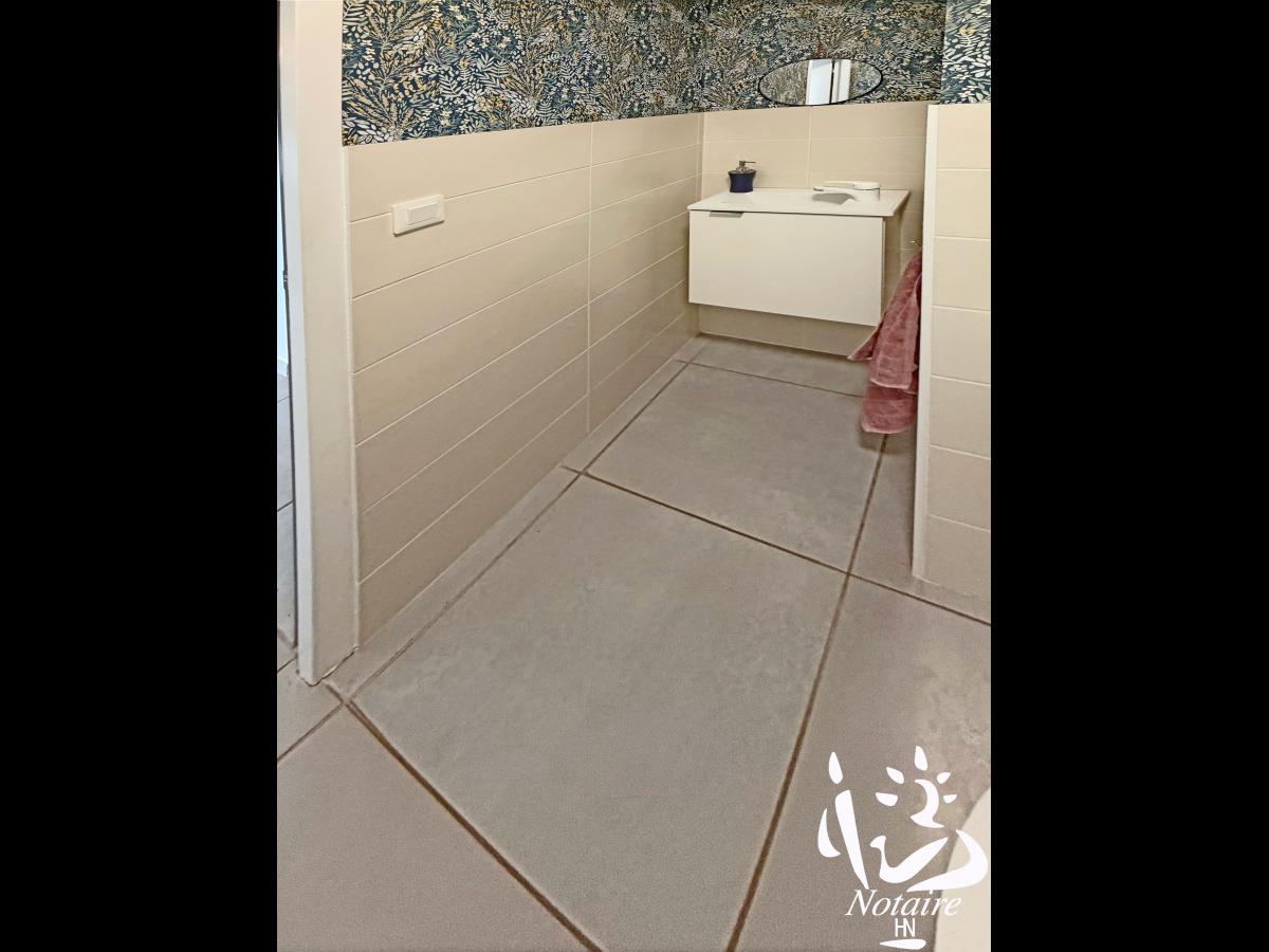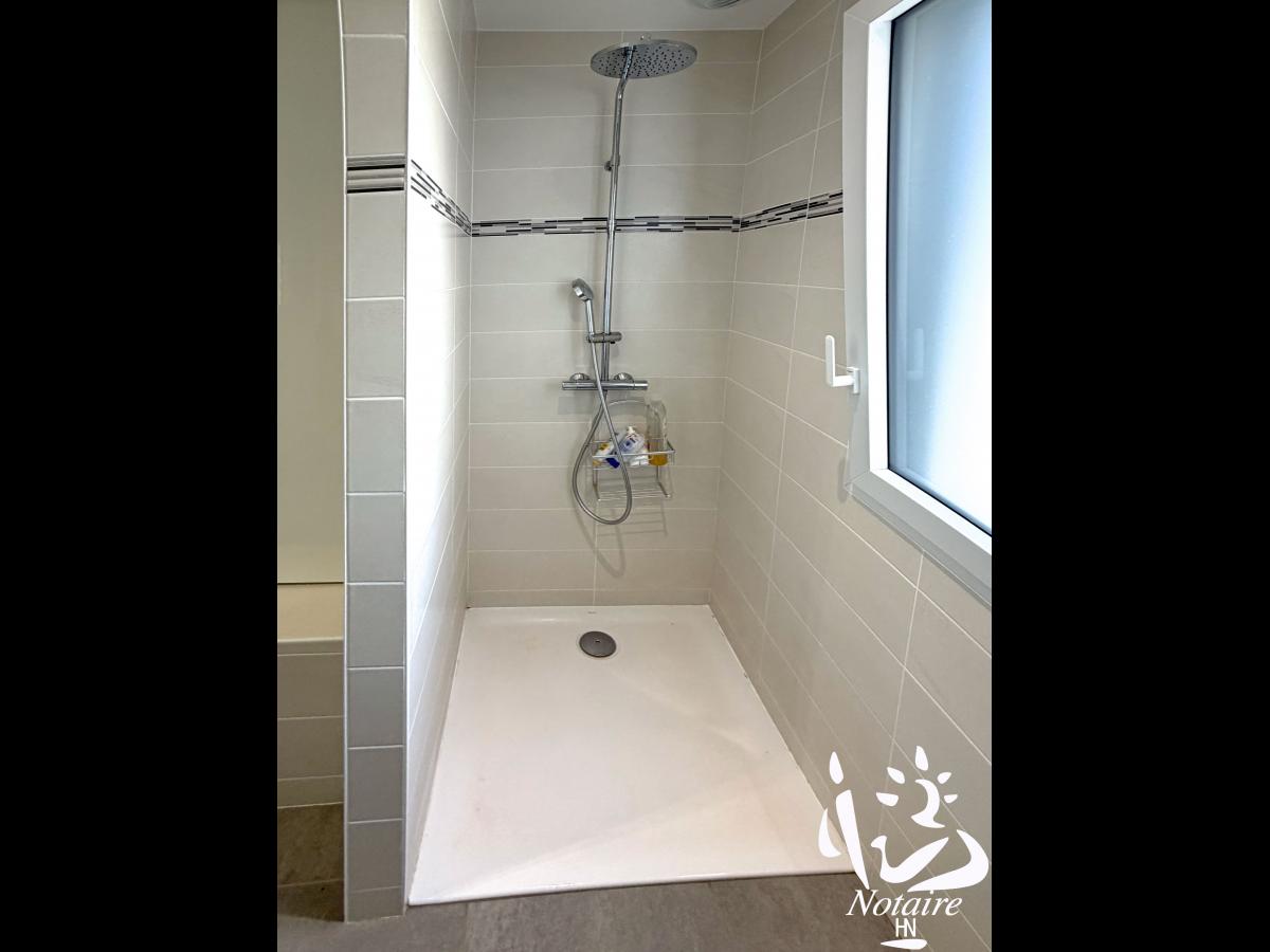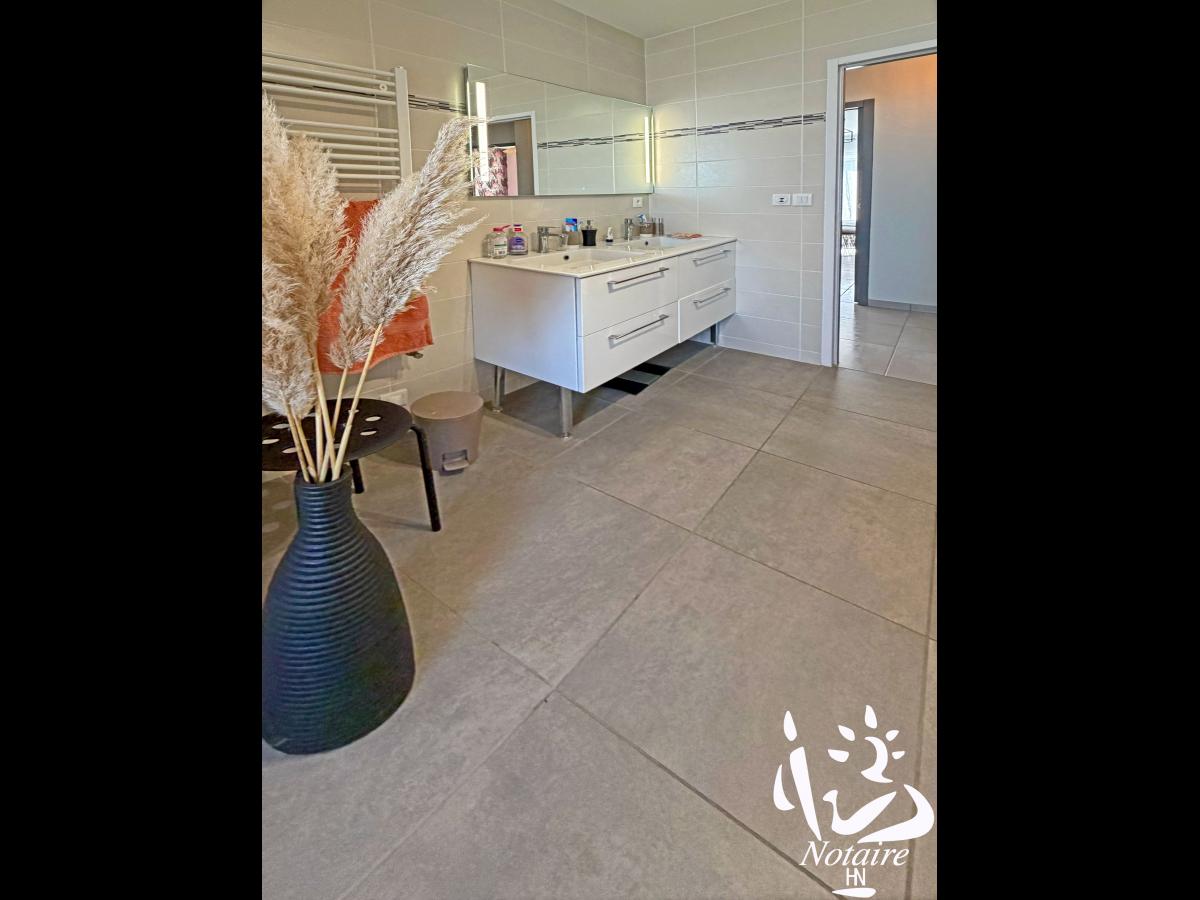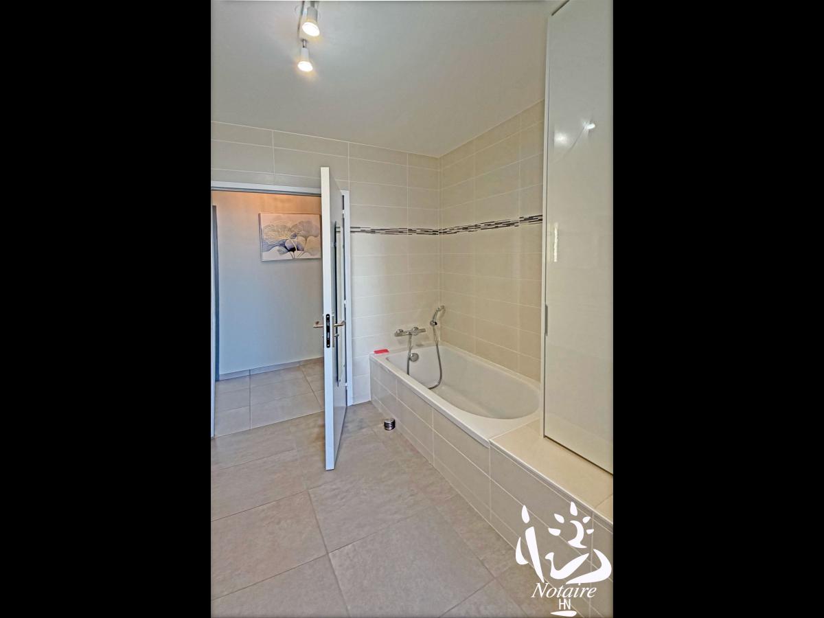 Le coin nuit dessert 3 chambres confortables avec rangements, wc avec lave-mains, ainsi qu’une grande salle de bains contemporaine avec baignoire et douche, avec un placard sur mesure ( qui reste également ), à droite de la baignoire.