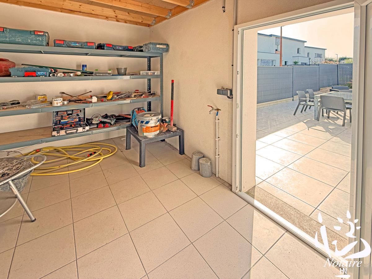 Terrasse carrelée agréable. À l’arrière, accolé à la maison , un abri de jardin maçonné avec accès direct à la terrasse complète l’ensemble.